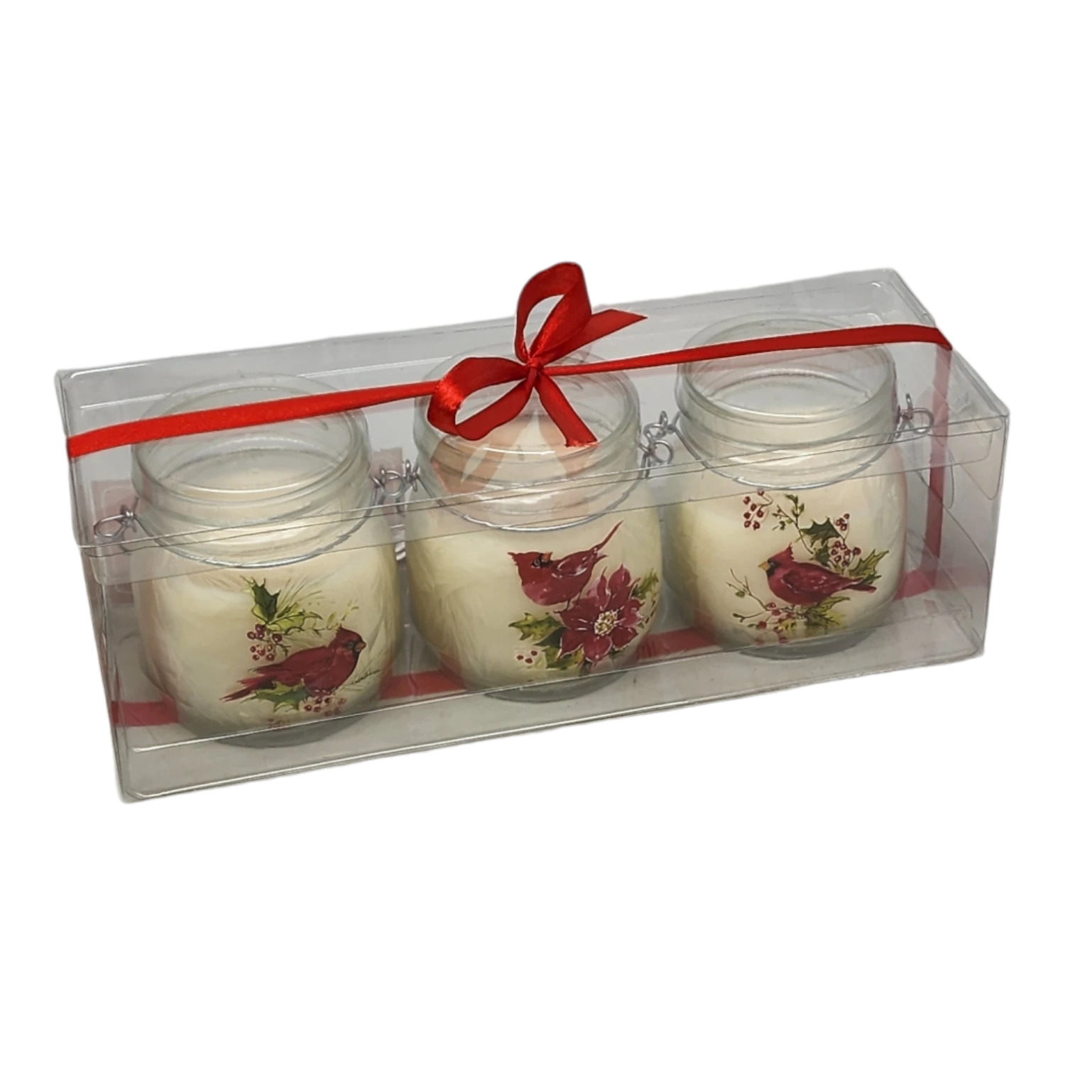 Elevate your holiday ambiance with this charming set of three jar candles, each beautifully adorned with vibrant images of cardinals and festive greenery. Measuring 3.5 inches by 3 inches, these candles bring a touch of nature indoors while filling your space with the delightful scent of White Christmas. The warm glow and inviting fragrance create a cozy atmosphere perfect for gatherings or quiet moments alike.