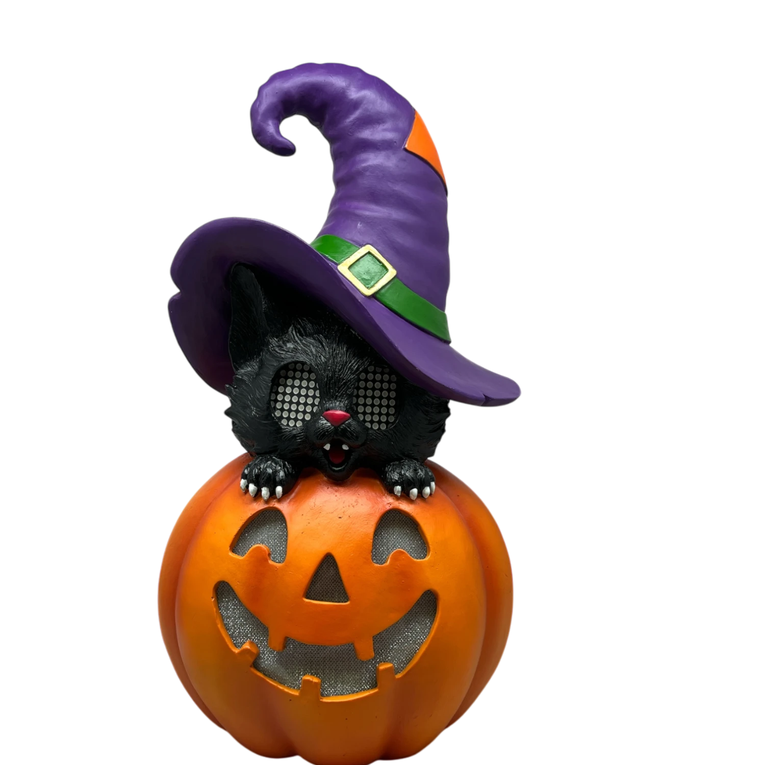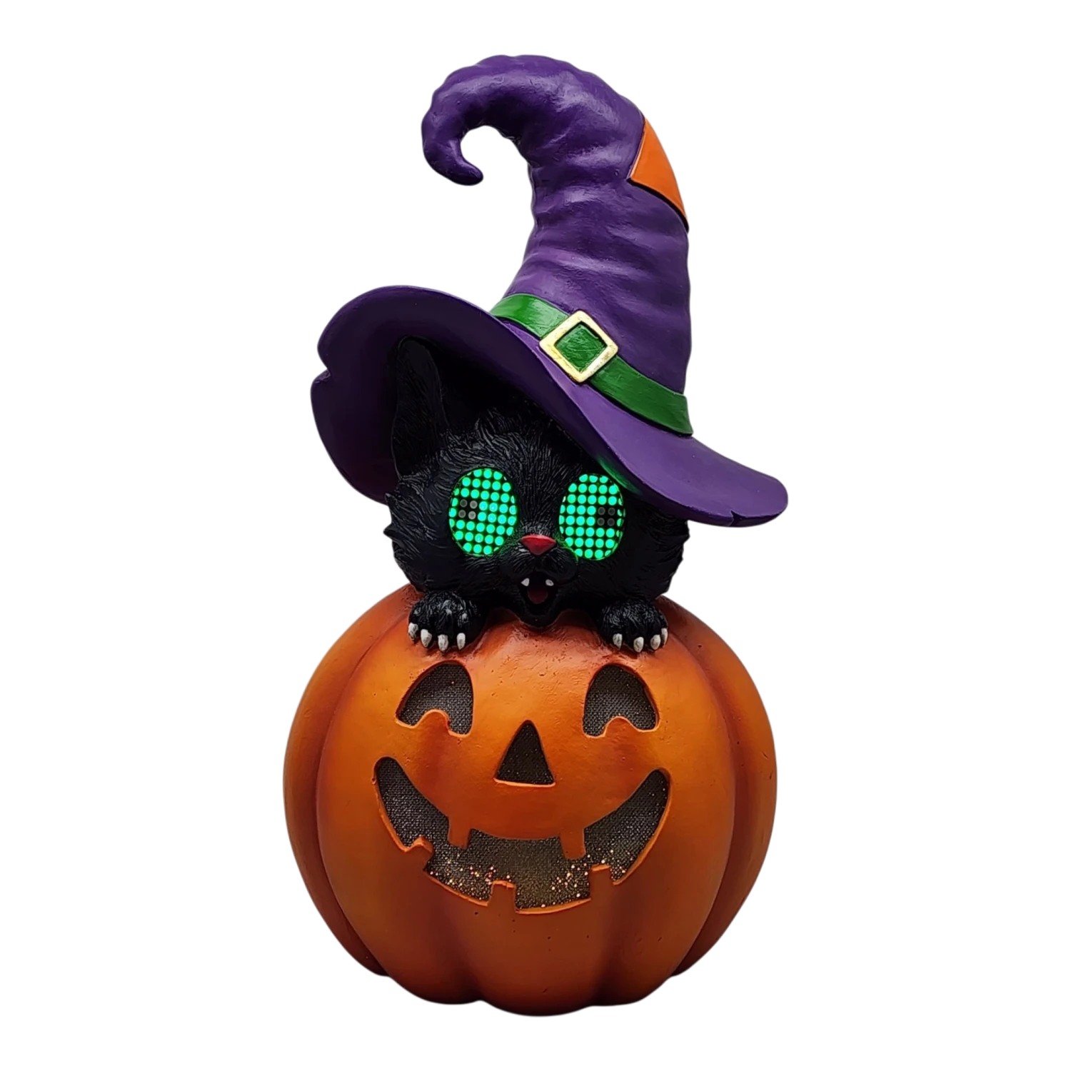 Embrace the spirit of Halloween with our enchanting Animated Halloween Cat on Pumpkin! Standing at an impressive 14 inches tall and measuring 8 inches wide by 5 inches deep, this delightful decoration features a charming black cat perched atop a classic jack-o’-lantern, complete with a playful purple witch’s hat. Its expressive design and vibrant colors make it a standout piece in any Halloween display.