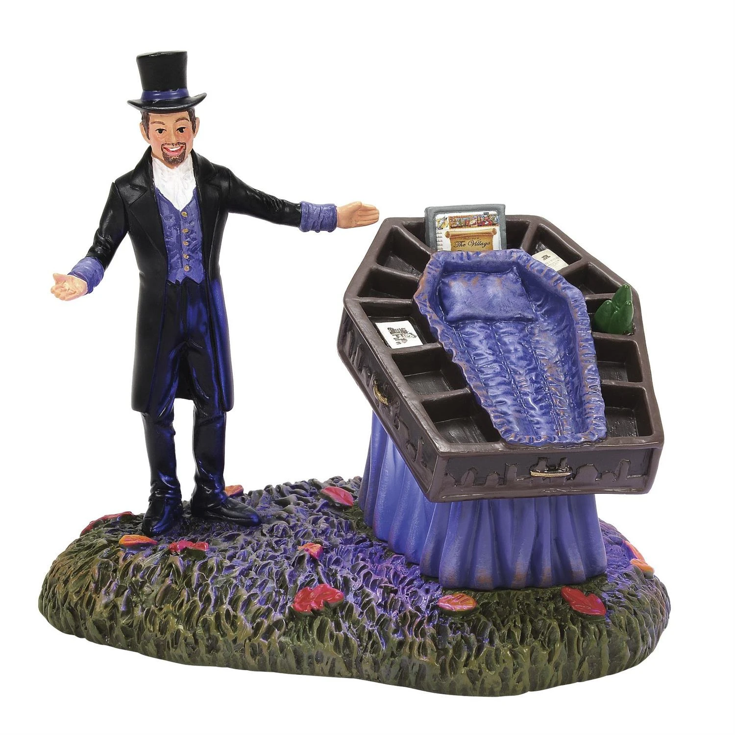 Enhance your Halloween Village with the quirky charm of “Richard Puckett’s Haunted Collection,” a delightful figure standing at just under 4 inches tall! This lighted accessory features the likeness of Richard Puckett, a longtime collector and past President of the National Council of 56 Collectors (NCC), known for his passion for the Department 56 Christmas Village collection. With a creative twist, this piece playfully suggests that you can take your treasured collections with you into the afterlife, showcasing a uniquely designed coffin transformed into a whimsical display.