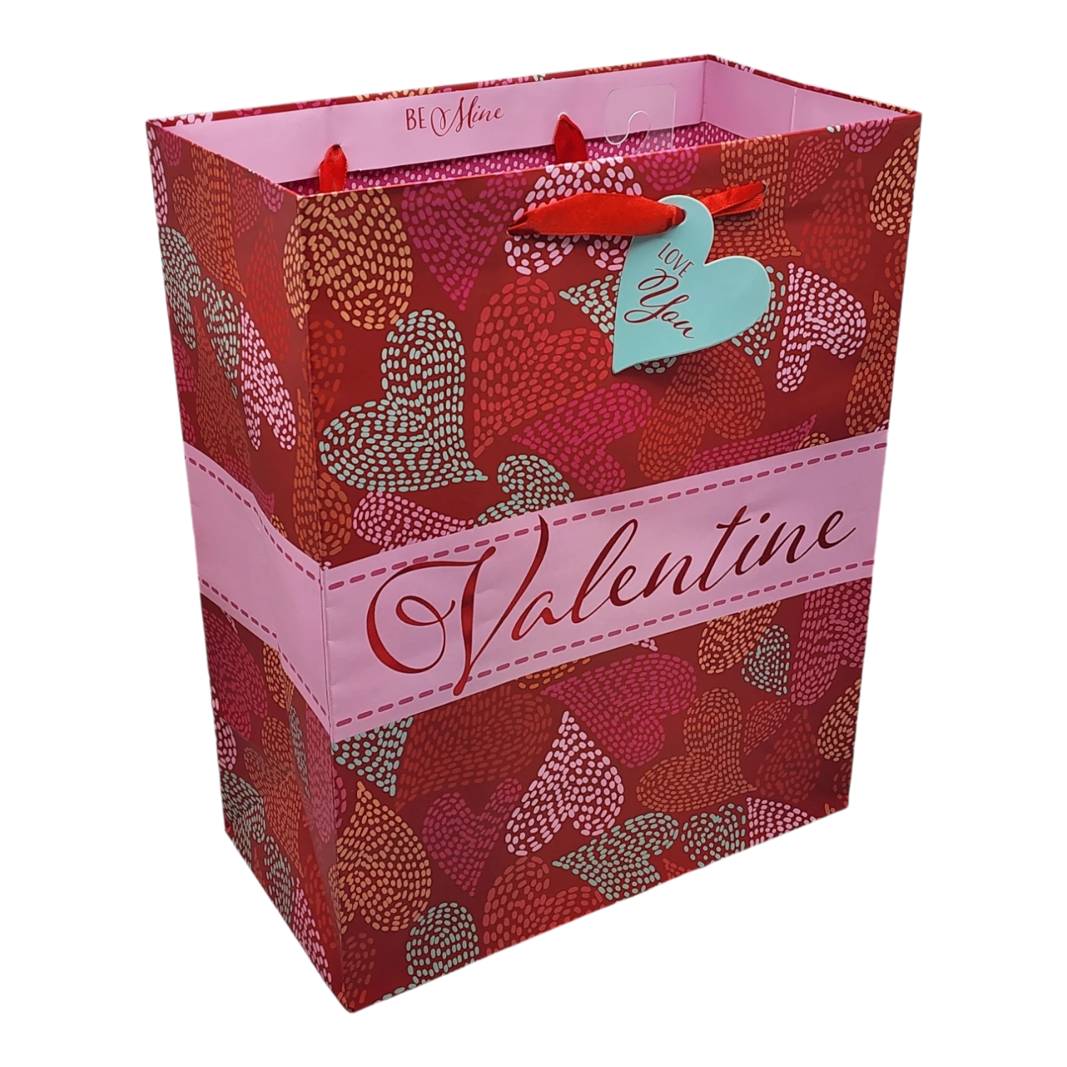 Celebrate love in style with our charming Valentine’s gift bag, perfect for presenting your heartfelt surprises. Adorned with a vibrant array of hearts in various hues, this spacious bag captures the essence of affection. The elegant “Valentine” script adds a touch of class, making it an ideal choice for conveying your romantic sentiments.