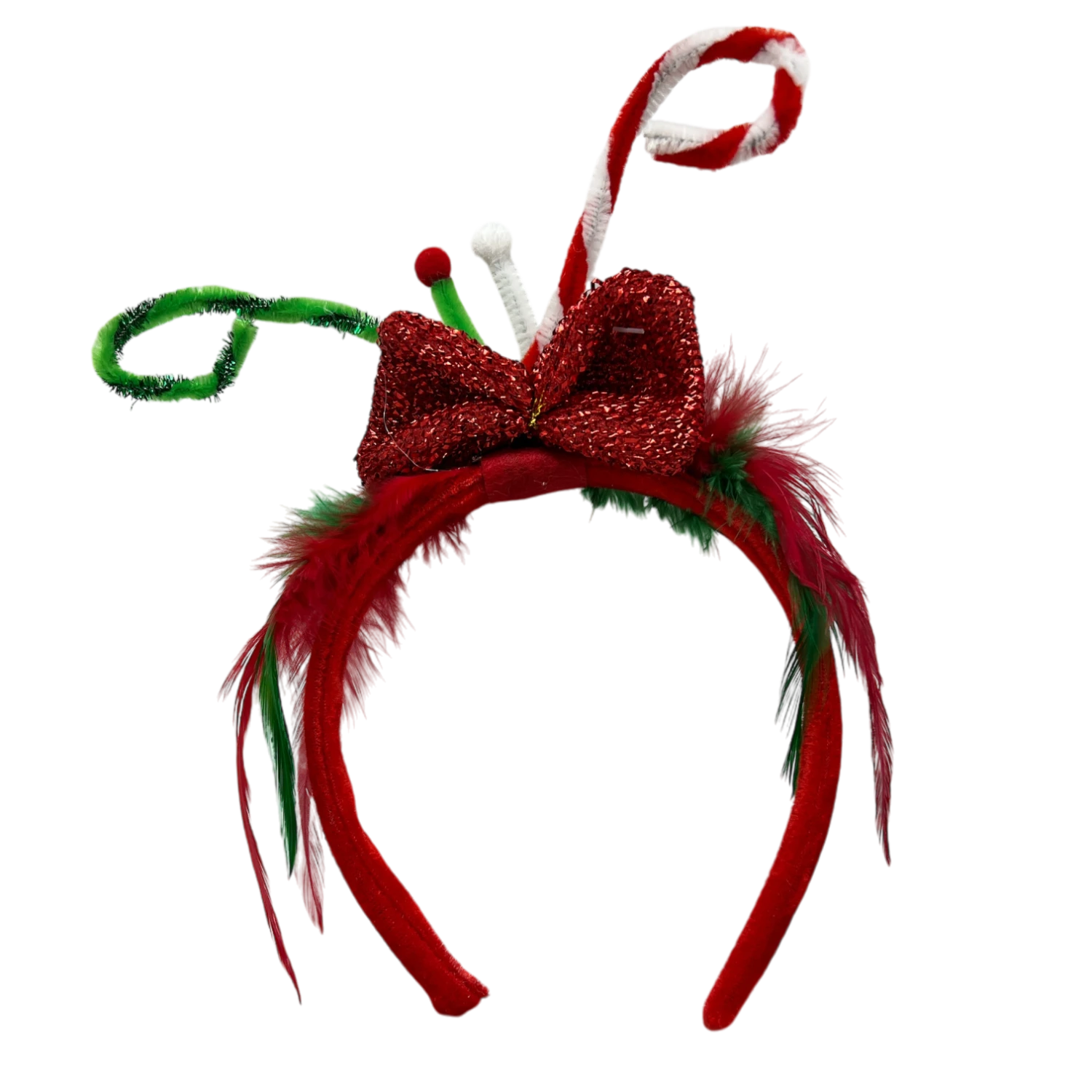 Get ready to dazzle this holiday season with our whimsical Christmas Candy Cane Headband! Bursting with festive cheer, this playful accessory features a red and green plush base adorned with a sparkling glitter bow, feathery accents, and delightful candy cane antennas. Perfect for holiday parties, festive gatherings, or simply adding some seasonal sparkle to your day-to-day, this headband is sure to make you the star of any holiday celebration.