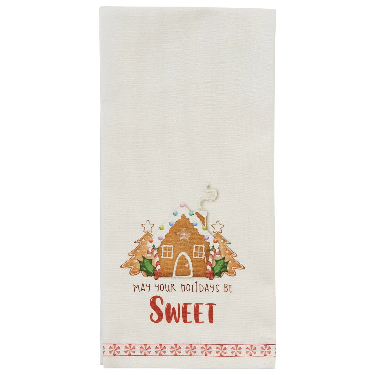 Celebrate the sweetness of the holiday season with this charming 100% cotton towel. Measuring 18″ x 26″, it features an adorable gingerbread house design, surrounded by festive decorations and adorned with the heartwarming message: “May Your Holidays Be Sweet.” The delightful illustration captures the essence of cozy holiday baking, complete with candy canes, gumdrops, and twinkling lights, making it a perfect addition to your kitchen decor.