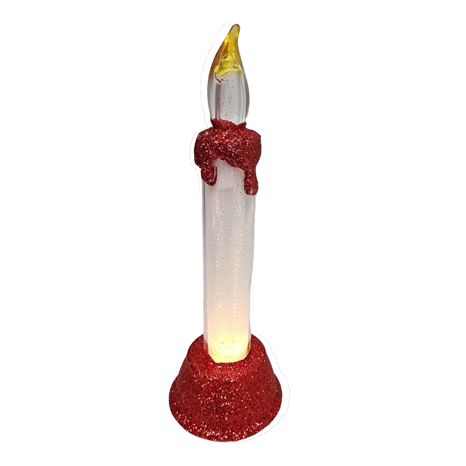 These battery-operated glittered LED candles are a beautiful addition to your home holiday décor. Choose from a red, silver, gold or green glittered candle that is illuminated with one warm white LED light.