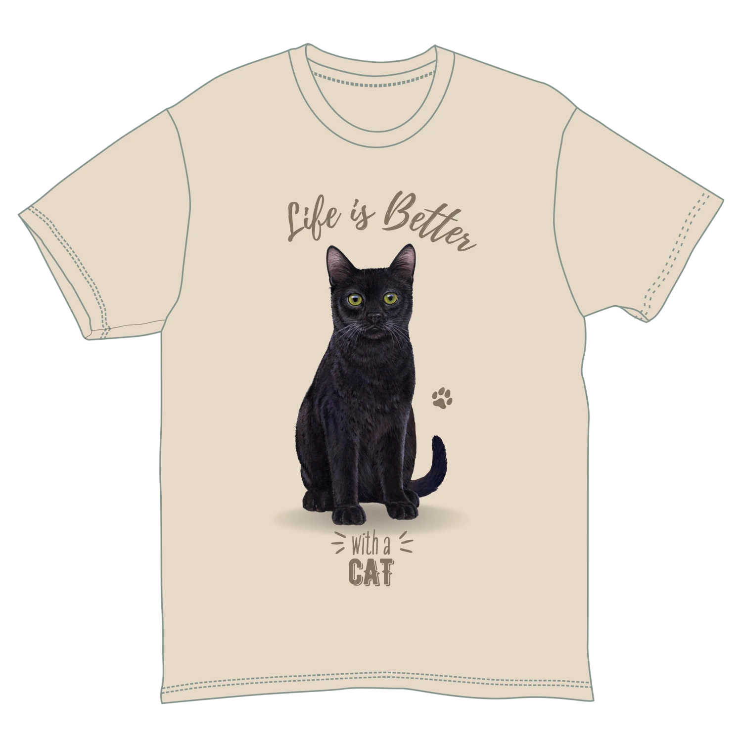 This charming t-shirt, made from 100% soft cotton, features a delightful illustration of a black cat alongside the phrase “Life is Better with a CAT.” With its neutral beige color and unisex design, it’s a comfortable and stylish choice for any cat lover, perfect for casual outings or cozy days at home.