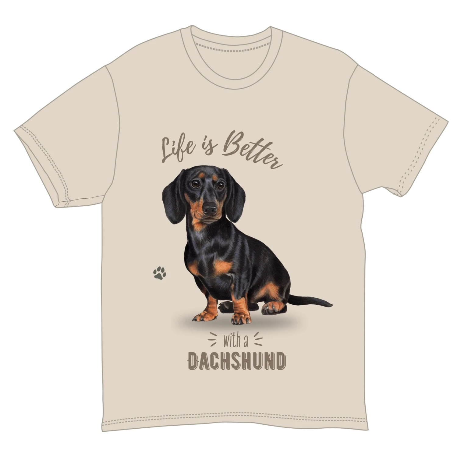 This charming t-shirt, made from 100% soft cotton, features an adorable illustration of a Dachshund alongside the phrase “Life is Better with a DACHSHUND.” Its neutral beige color and unisex design provide a comfortable fit, making it perfect for casual outings or relaxed days at home.