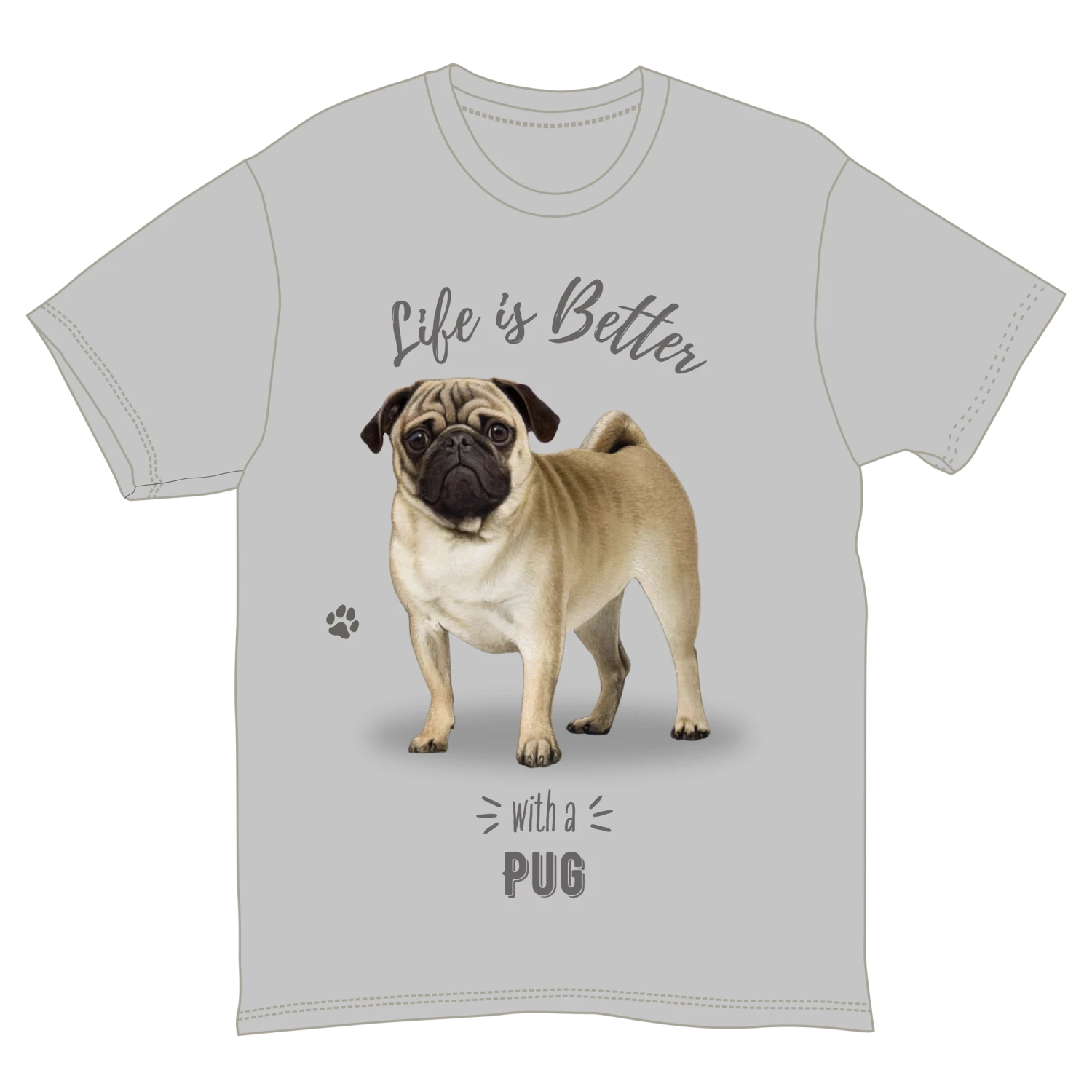 This adorable t-shirt, made from 100% soft cotton, features a charming illustration of a pug along with the phrase “Life is Better with a PUG.” In a stylish light gray color and unisex design, it offers comfort and versatility, making it perfect for casual outings or relaxed days at home.