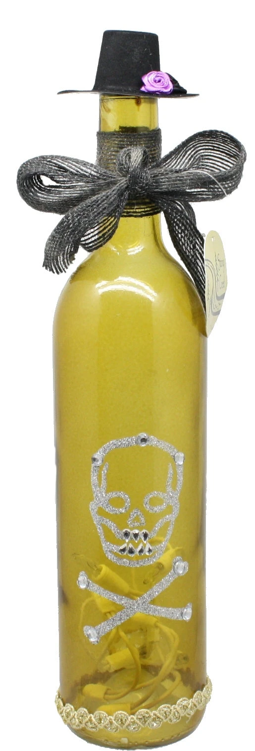Add a touch of spooky fun to your home decor with this lighted yellow glass bottle featuring a glitter skull and cross bones, trimmed in ribbon and topped with a hat. Measuring 15 inches tall, 3 inches wide, and 3 inches deep, it’s sure to be the perfect addition to your Halloween display!More like thisSaveCopy