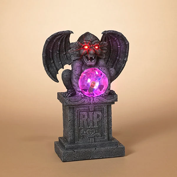 14.17″ Tall Resin Gargoyle on Tombstone with Static Lighted Magic Ball.