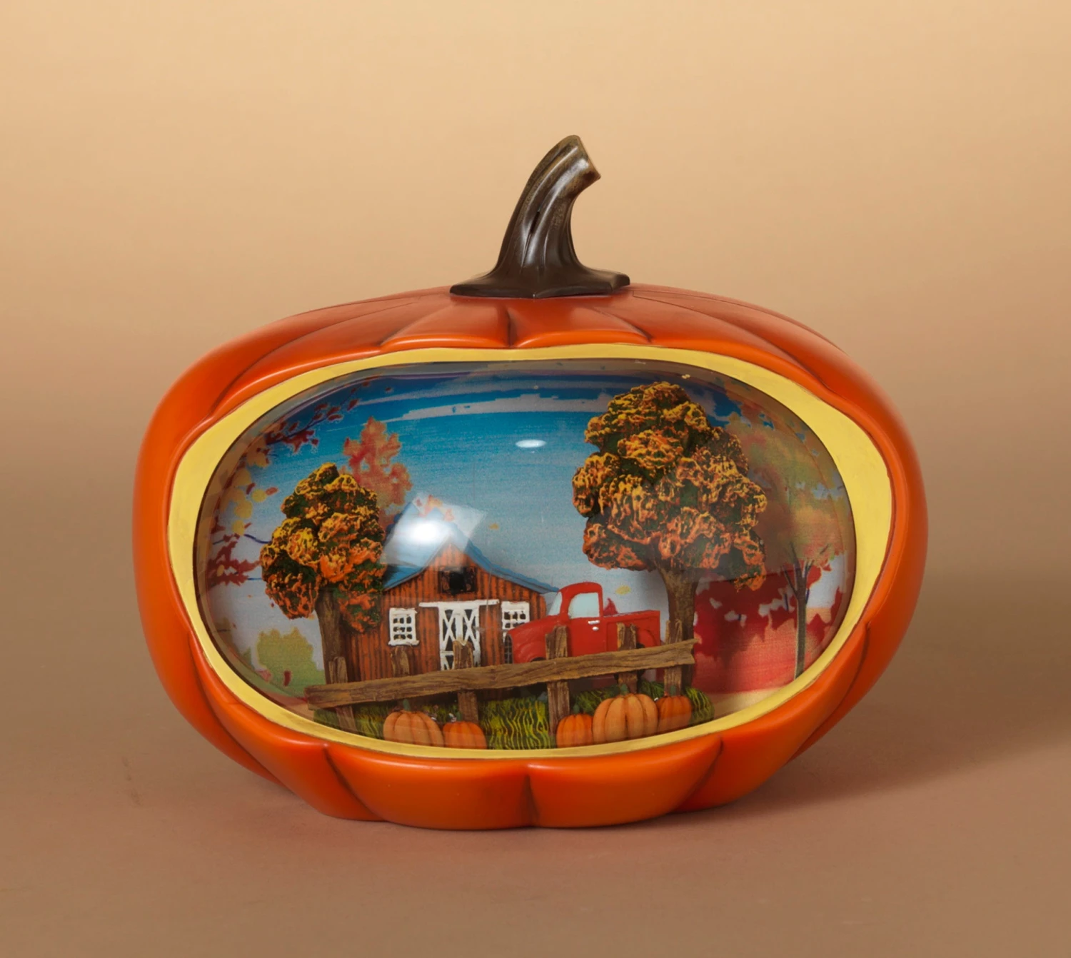 As unique a waterglobe as we’ve seen. This battery operated snowglobe contains a harvest scene encased within a polyresin Pumpkin. Add batteries, and the pumpkin lights from within while gentle motors move the water in a continuous spinning action to create a vibrant scene. Perfect for a mantle or Table Centerpiece.