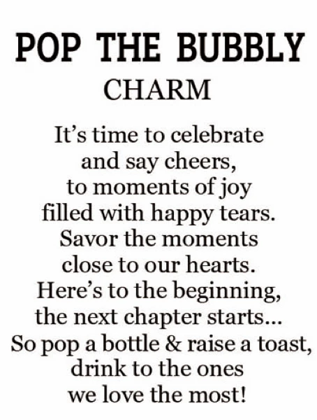 “It’s time to celebrate and say cheers, to moments of joy filled with happy tears. Savor the moments close to our hearts. Here’s to the beginning, the next chapter starts…So pop a bottle and raise a toast, drink to the ones we love the most! “
