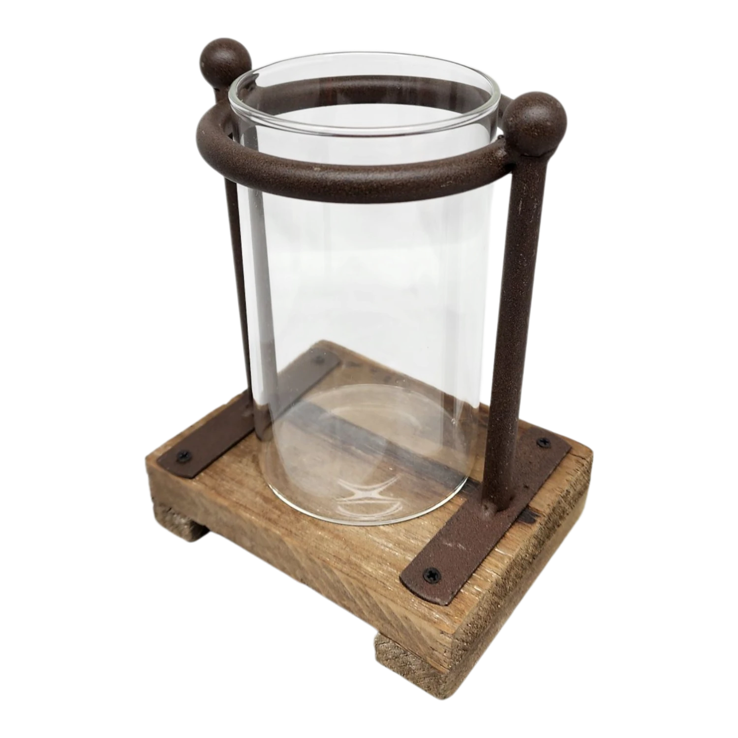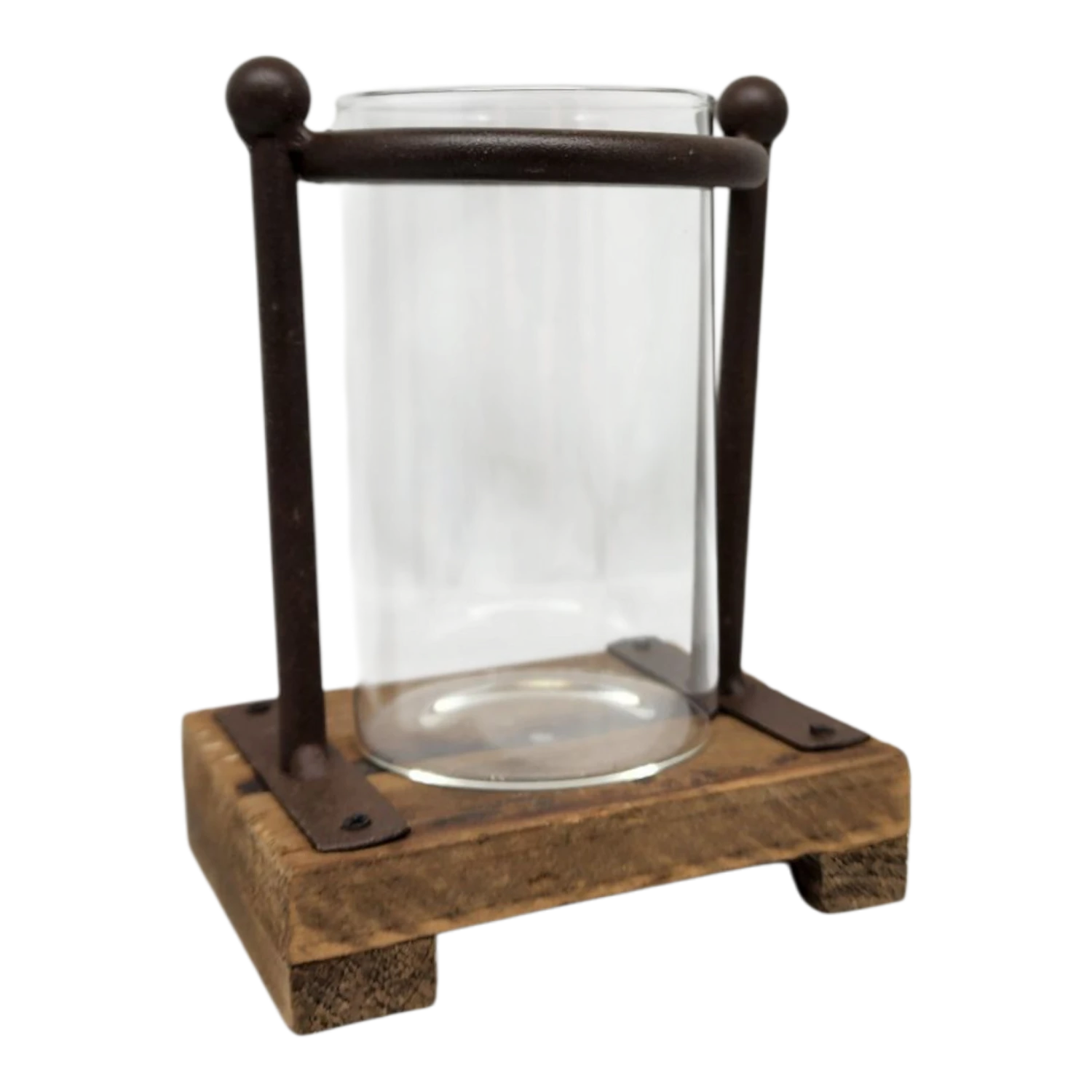 Bring a touch of rustic charm and industrial elegance to your home with the Industrial Style Glass Vase Holder! Standing at 6.3 inches tall and measuring 4.5 inches wide by 3.5 inches deep, this unique piece features a solid wood base paired with a cast iron holder that showcases a removable glass vase. The combination of natural materials and metal creates a stunning centerpiece that beautifully complements any decor style, from modern to farmhouse.