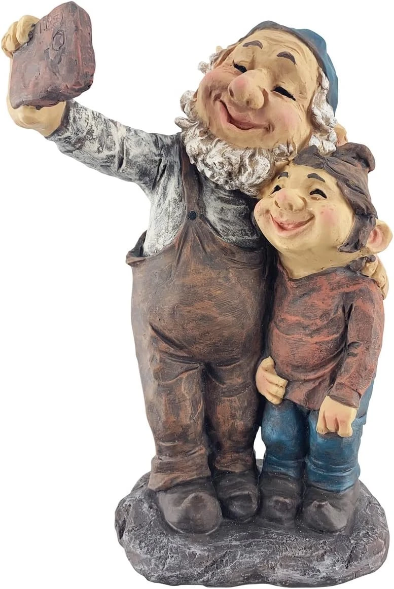 Meet our delightful Gnome Taking a Selfie statue, a whimsical addition that’s sure to spread cheer and joy throughout your garden! Standing at 13 inches high with a width of 8 inches and a depth of 7 inches, this charming piece features a heartwarming scene of a friendly gnome capturing a memorable moment with his favorite little companion. Crafted from durable resin and skillfully hand-painted, every detail brings this heartwarming scene to life, making it a perfect focal point for any outdoor space.