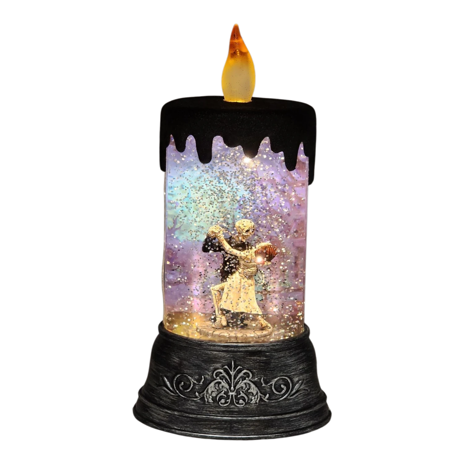 The candle includes a flickering LED flame on top, creating a warm glow that sets a delightful ambiance while enhancing the eerie charm of the skeletal couple. Inside the globe, swirling water and sparkling glitter come alive, creating a mesmerizing effect that draws attention and sparks joy. You can easily power it using either 3 AA batteries (not included) or the included USB cord, providing flexibility for your decorating needs.