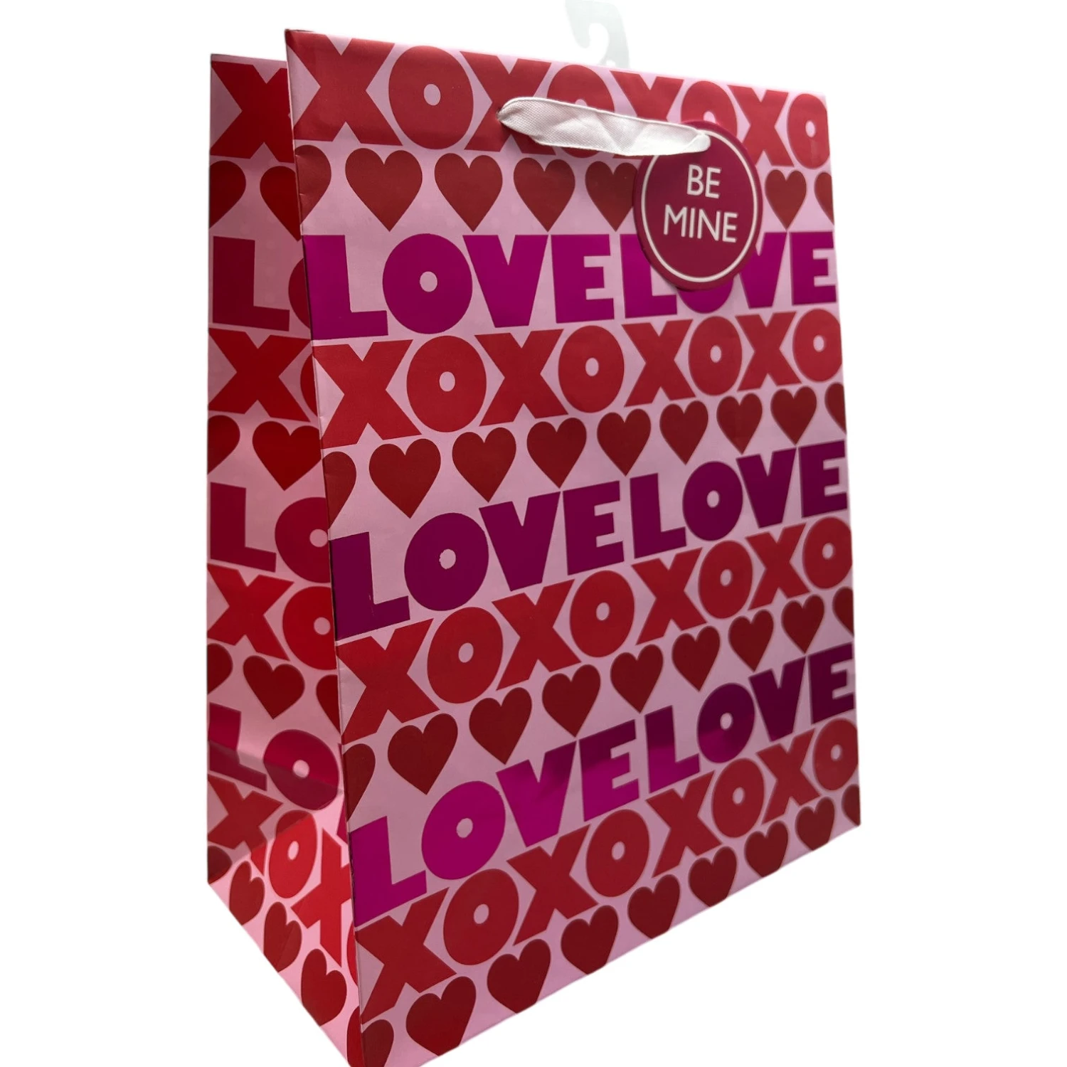 Express your affection this Valentine’s Day with the lively **Be Mine Gift Bag!** Measuring 12.5 inches by 10 inches with a depth of 5.5 inches, this spacious bag is perfect for presenting all your thoughtful gifts. Its vibrant design features large “LOVE” and “XOXO” lettering surrounded by playful hearts, making it an eye-catching choice for your special someone.